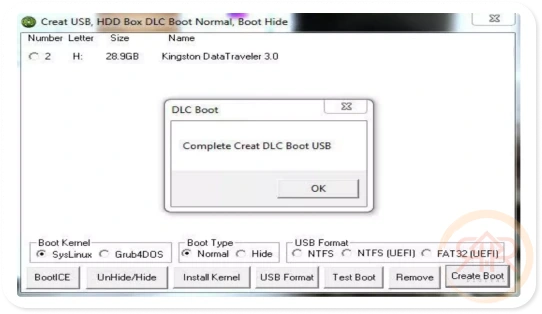 – Setelah Muncul Notifikasi Complete Create DLC Boot USB Itu Tandanya DLC Sudah Selesai Di Buat Pada Flashdisk yang telah dipilih.