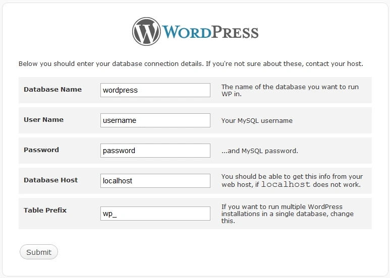 Setelah Anda menyelesaikan semua langkah sebelumnya, akses URL di browser web untuk menjalankan skrip instalasi WordPress.