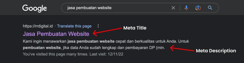 Judul harus berisi kata kunci Anda, dan harus dapat menggambarkan isi halaman. Itu harus berisi kurang lebih 60 karakter. Meta Deskripsi juga harus berisi frasa kata kunci Anda, dan harus terdiri dari 160 karakter atau Lebih.